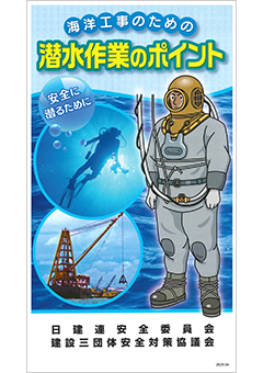 海洋工事の現場で潜水作業に携わる皆さんを対象に、潜水作業に伴う各種トラブルや災害事例をイラスト用いて解説し、安全対策を簡潔にまとめたリーフレット。平成27年4月の高気圧作業安全衛生規則改正を反映しています。