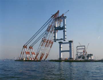 4100t吊りのフローティングクレーンで塔の上半分を吊り上げる。工事中は橋よりも、パイプとケーブルのクレーンが風景の主役である。