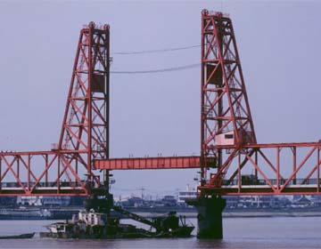 若津港に出入りする船舶用に考えられた我が国初の昇開式鉄道可動橋。軌道面から23mも上昇するその構造はさぞかし当時の人々を驚かせたことだろう。