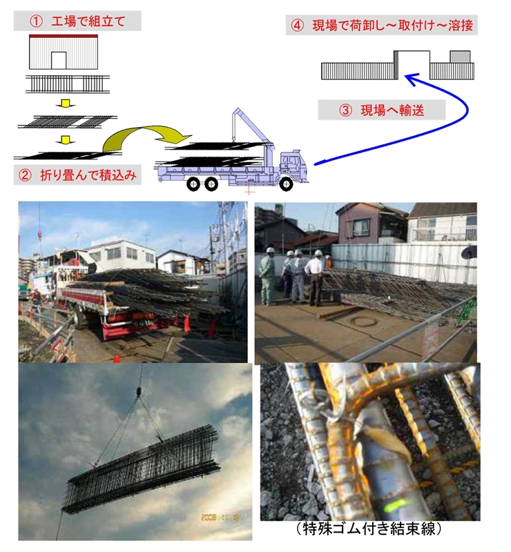 | 鉄筋ジャバラユニット工法 | 鉄筋工事における各部位(柱、梁、壁、スラブ等)を、特殊ゴム付き結束線で工場にて先組みし、ジャバラユニット化する事により、施工現場に於いての組立作業を大幅に省力化、省人化する工法。 | 2019-躯体(RC)-12-r1 | |